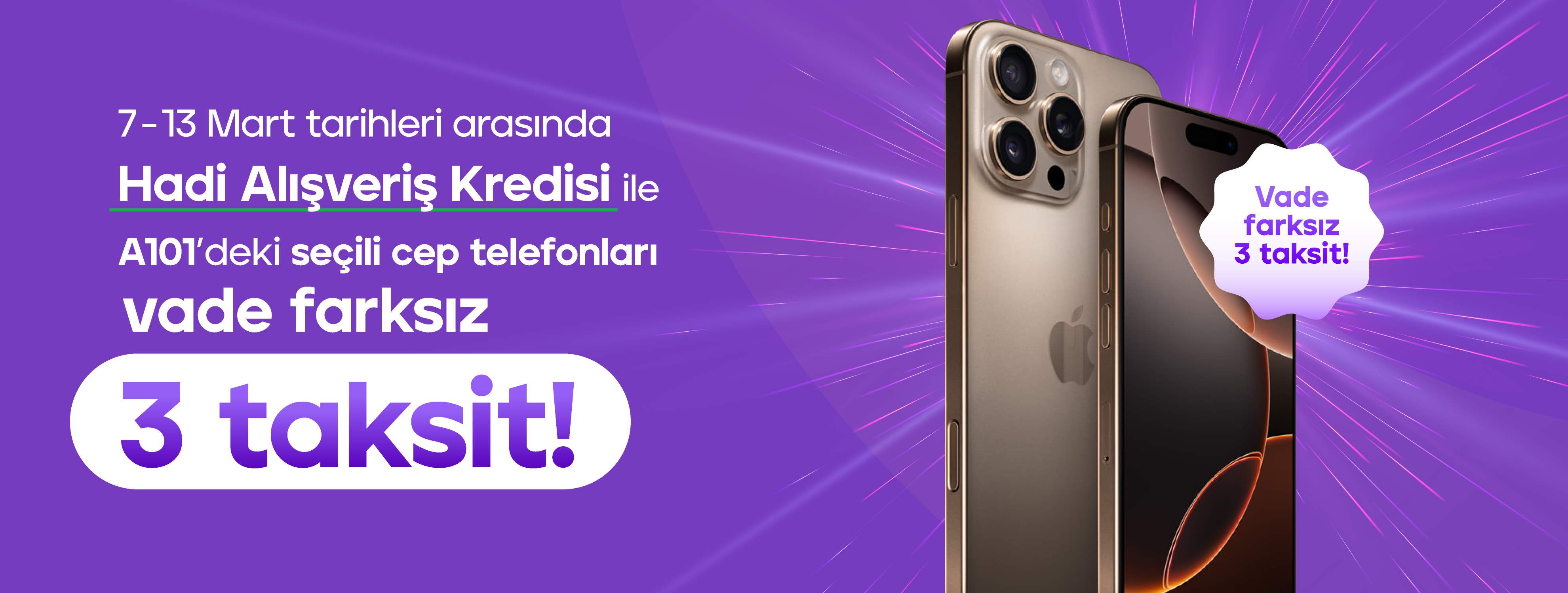 7-13 Mart tarihleri arasında Hadi Alışveriş Kredisi ile A101’deki seçili cep telefonlarında vade farksız 3 taksit!