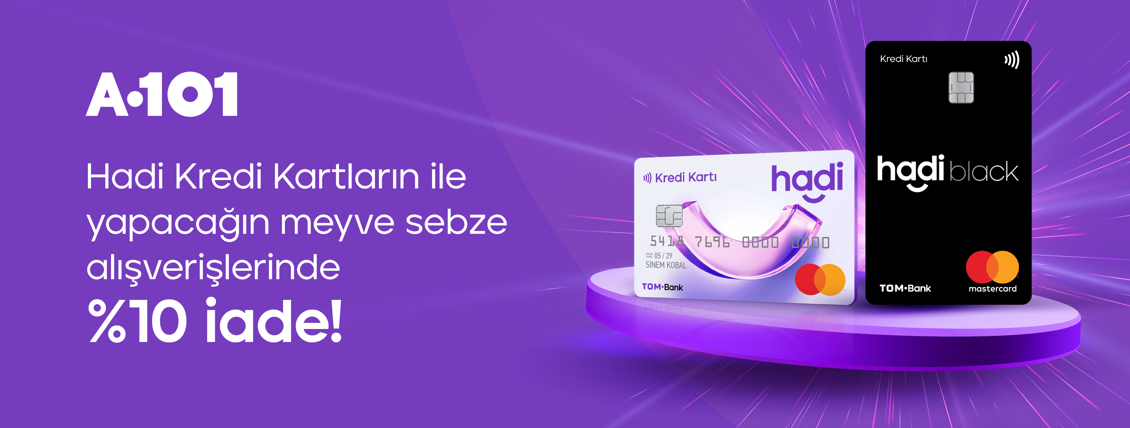 - Meyve sebze harcamalarından kazanılan nakit iade, A101’de %3 kampanyasının sağladığı kazanıma ek olarak %7 olacak şekilde hesaplanır ve TOM Bank Hadi hesabına aktarılır.
