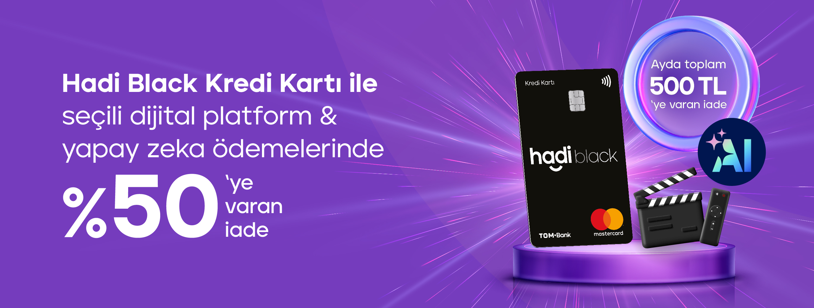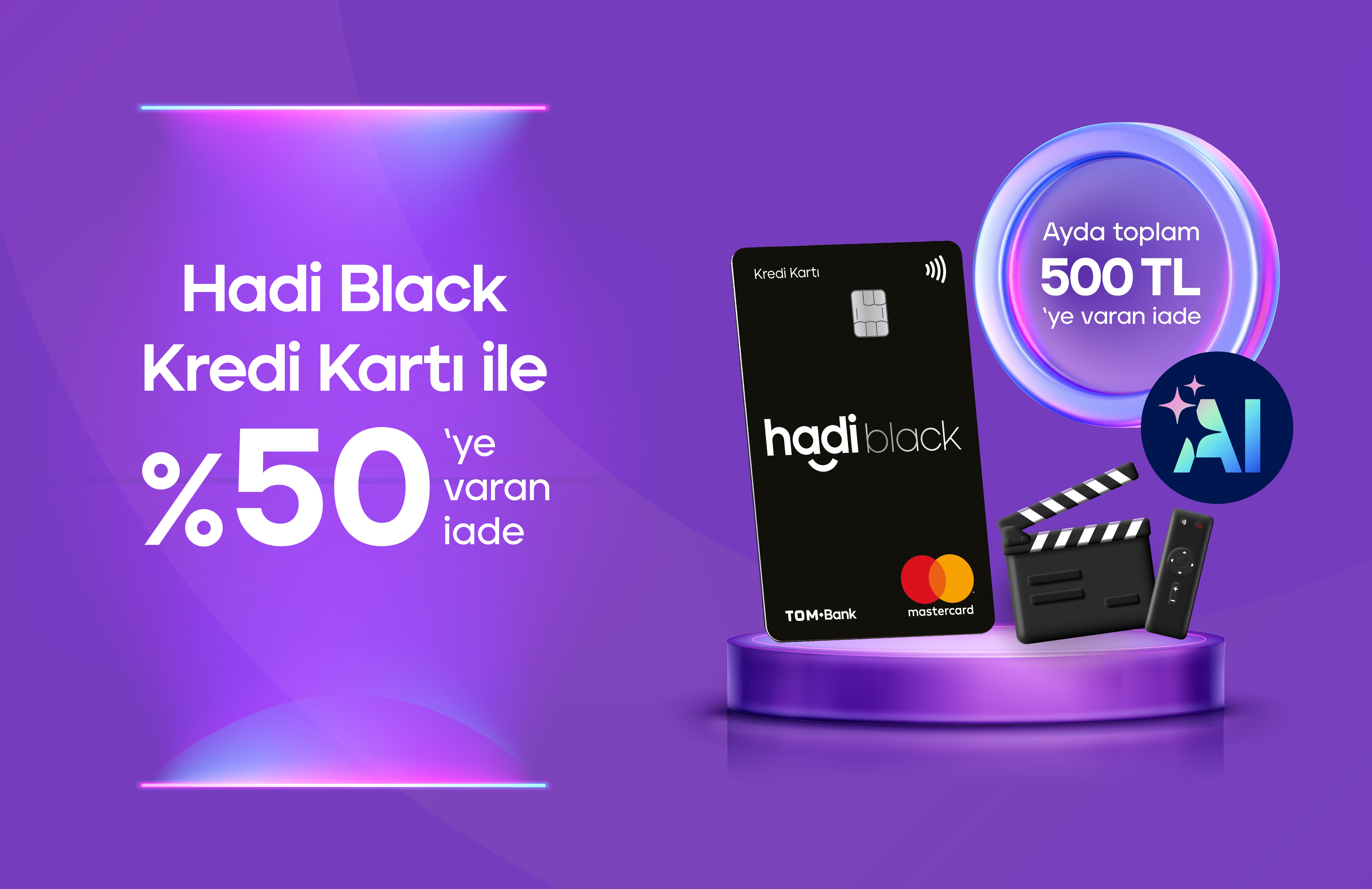 - Kampanya katılımı sonrasında Hadi Black Kredi Kartı ile bir takvim ayı içerisinde yapacağın seçili platform ödemelerinde %50 iade ile plaftorm ödemesi başına en fazla 50 TL iade kazanabileceksin.