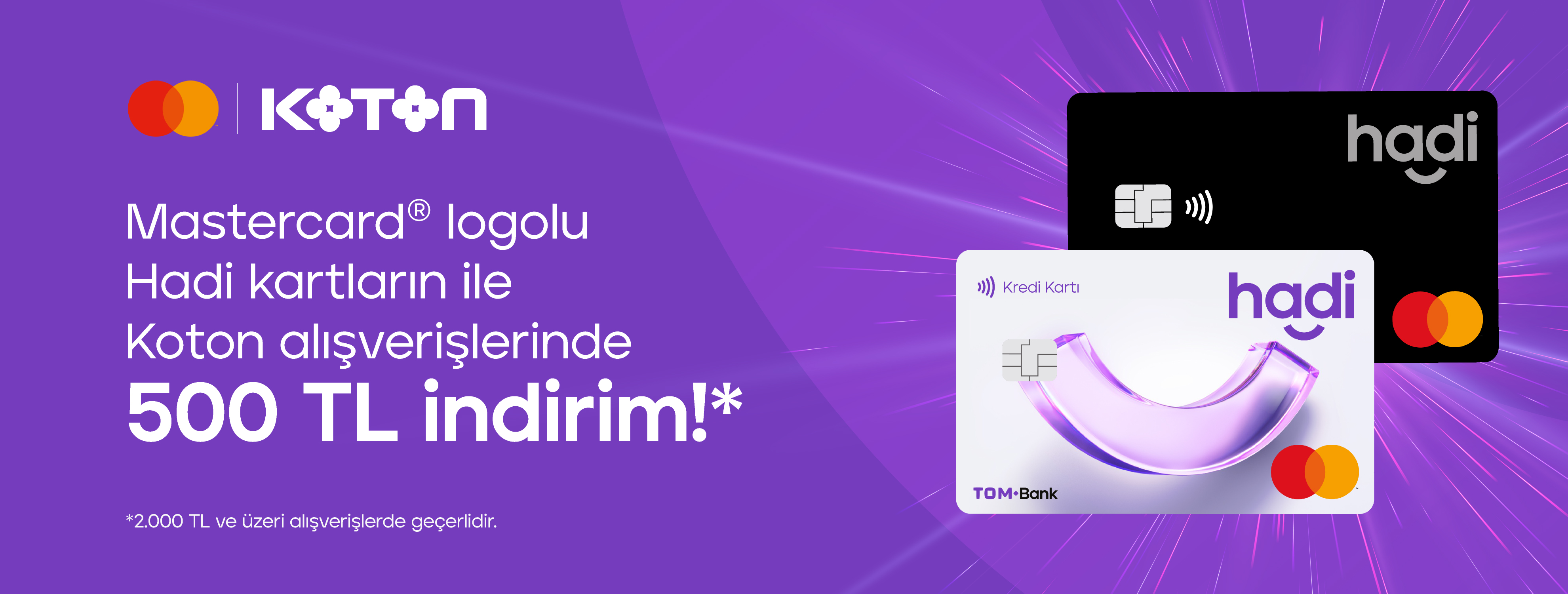 - Masterpass’e kayıtlı Hadi Mastercard® kredi kartı, banka kartı veya ön ödemeli kart ile www.koton.com veya Koton mobil uygulamasından yapılan 2.000 TL ve üzeri alışverişlerde 500 TL indirim uygulanacaktır.