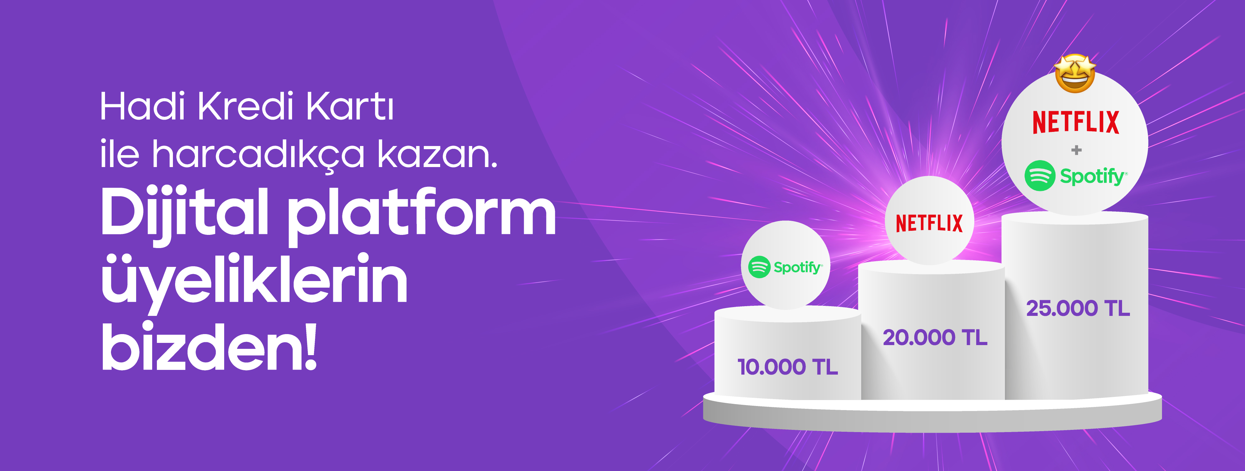 - Kampanya sadece Spotify ve Netflix'in kendi web siteleri veya mobil uygulamaları üzerinden Hadi Kredi Kartı ile yapılan harcamalarda geçerlidir. Diğer platformlar (ör: iTunes, Google Play, Apple TV vb.) ve ödeme yöntemleri (ör: telekomünikasyon şirketi üzerinden faturalandırma) aracılığıyla yapılan harcamalar kampanyaya dahil değildir.