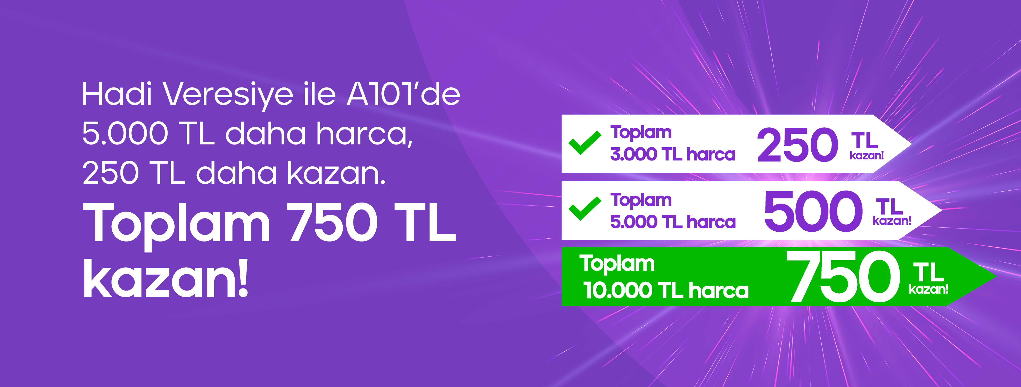 - 11 Aralık - 31 Aralık’a kadar Hadi Veresiye Yılın Kampanyasındaki 5.000TL harcamanın üzerine toplamda ek 5.000 TL ve üzeri tutarı A101 mağazalardan ve a101.com.tr’den harcaman gerekmektedir. Bu kampanya için kampanya dönemi boyunca, günlük en fazla 1000 TL tutarındaki harcamalar kampanya hakedişine dahil edilir.
