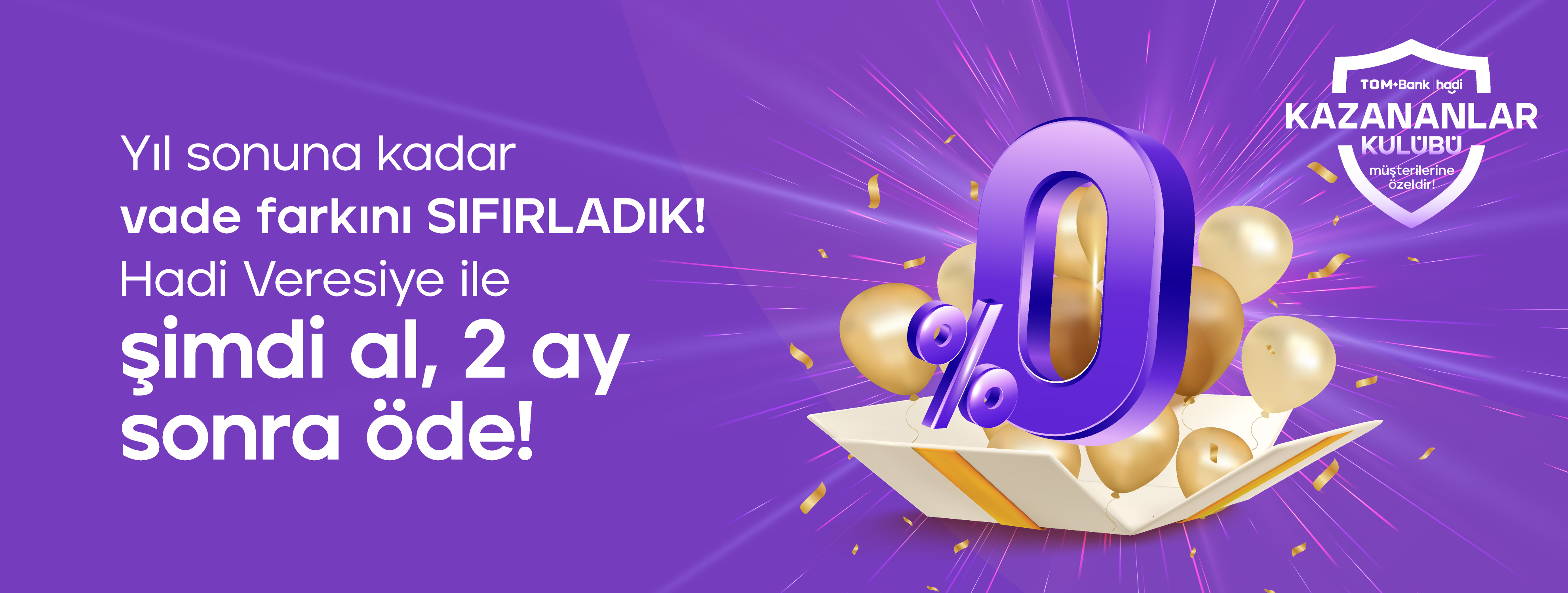 1 Nisan - 31 Aralık 2026 tarihleri arasında TOM Bank Hadi Kazananlar Kulübü müşterilerine özel, Hadi Veresiye ile aynı kredi döneminde yapacağın tüm alışverişlerin vade farksız!