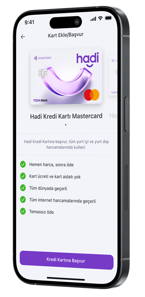 Hadi Kredi Kartı, Hadi’den başvurarak aidat ve masraf ödemeden alabileceğin kredi kartıdır. Başvuru sonucunda verilen limitin ile yanında nakit para taşımana gerek kalmadan tüm harcamalarını güvenle yapabilirsin.