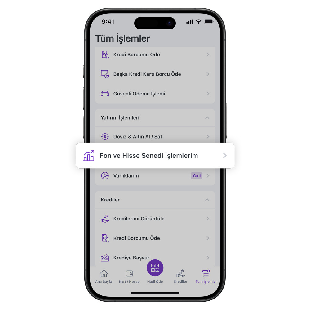 “Tüm İşlemler/Yatırım İşlemleri/Fon ve Hisse Senedi İşlemlerim” altında yer alan “Portföyüme Para Yatır” ve “Portföyümden Para Çek” menüleri üzerinden para yatırma ve çekme işlemini gerçekleştirebilirsin.