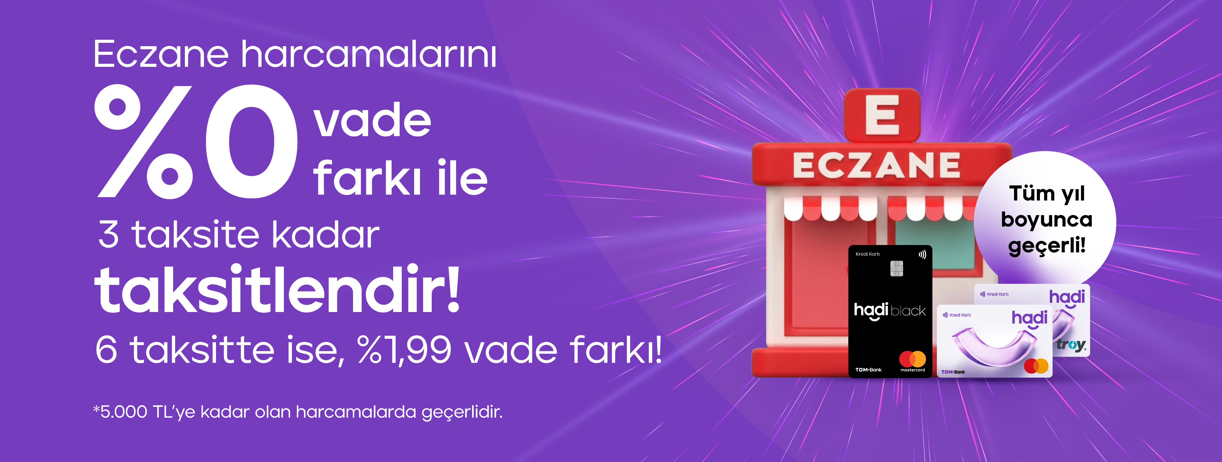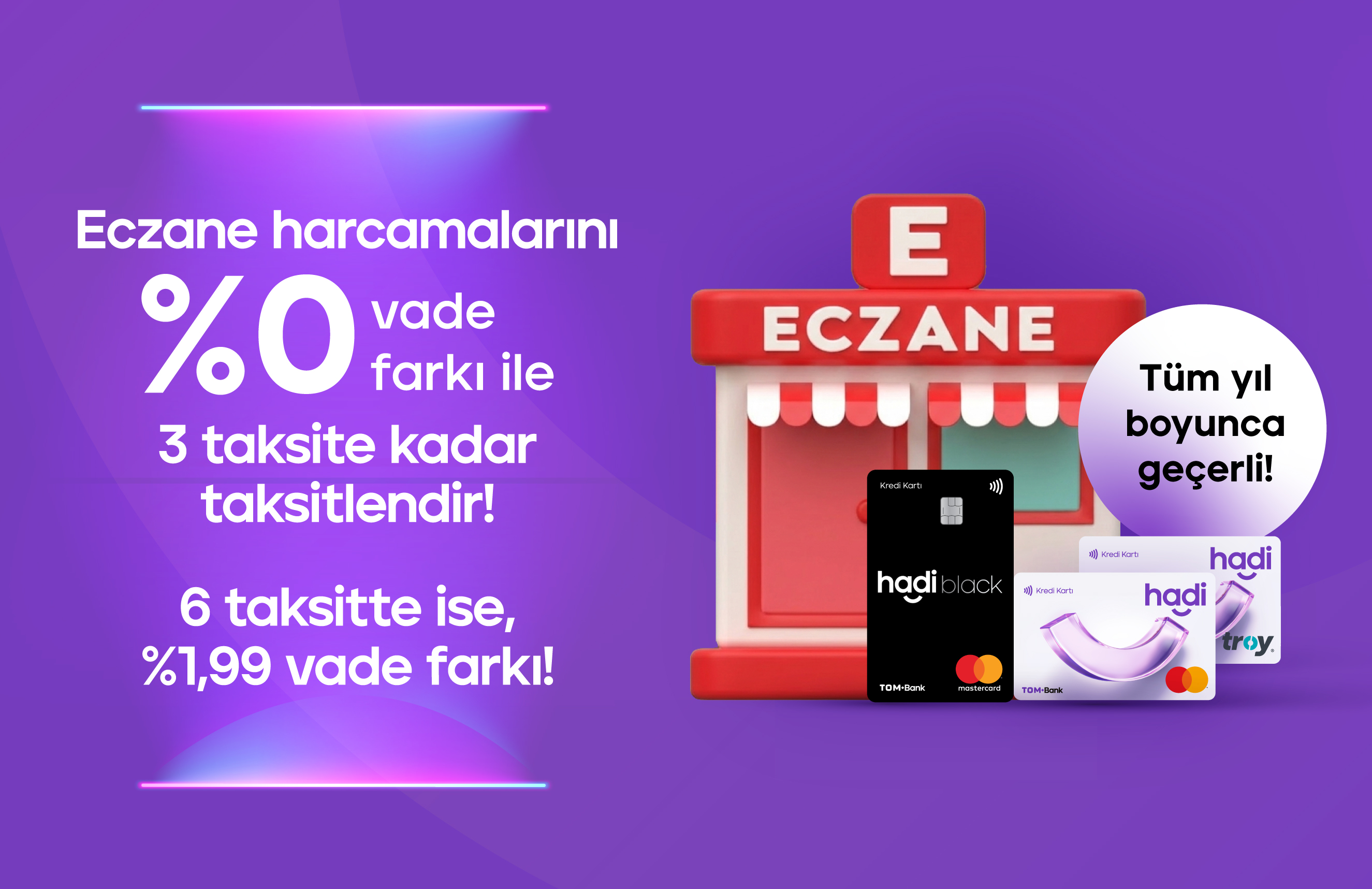 • Kampanya, 31 Aralık 2026 tarihine kadar, Hadi Kredi Kartı ve Hadi Black Kredi Kartı ile yapılan 5.000 TL’ye kadar olan eczane harcamaları için geçerlidir.
